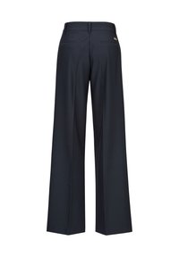 Marineblauwe broek met wijde pijpen, gemaakt van gladde stof, met een hoge taille, dubbele knoopaccenten en voorplooien voor extra structuur.