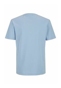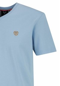 Lichtblauw katoenen T-shirt met een V-hals, korte mouwen en een klein geborduurd logo op de linkerkant van de borst. Soepele textuur en comfortabele pasvorm.