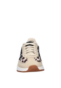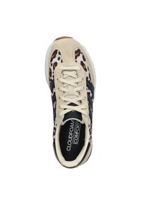 Beige sportschoen met een luipaardprint, voorzien van zwarte strepen en accenten, gemaakt van suède en textiel, met een rubberen zool.