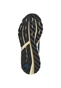 Hardloopschoen met een donkerblauwe mesh bovenkant, lichtblauwe accenten, een stevige crèmekleurige zool, gestructureerde details en elastische veters voor een stevige pasvorm.