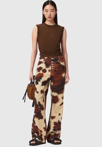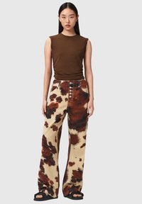 Jonge vrouw met stijlvol donker haar draagt een mouwloze bruine top en hooggetailleerde broek met koeienprint en zichtbare knopen, staand tegen een neutrale achtergrond.