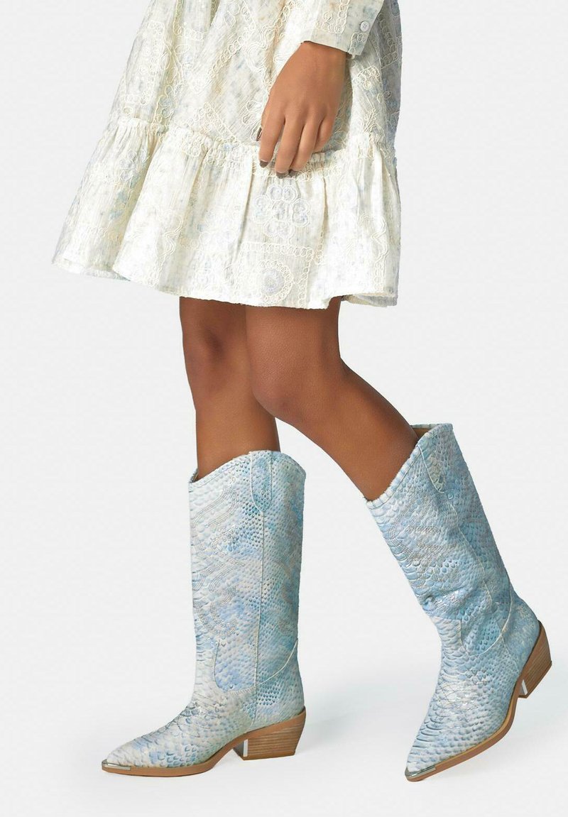 Vrouw draagt een witte kanten jurk en lichtblauwe cowboylaarzen met textuur en houten hakken, staand met één been licht opgetild.