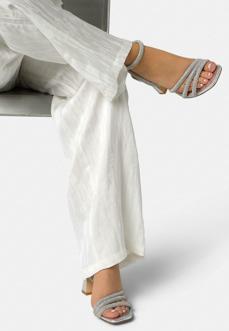 Voeten gekruist, dragend zilverkleurige sandalen met bandjes en blokhak, gecombineerd met witte, gestructureerde, wijde broekspijpen tegen een effen achtergrond.