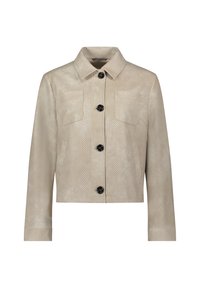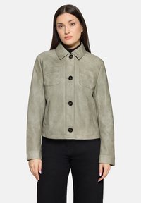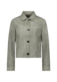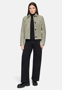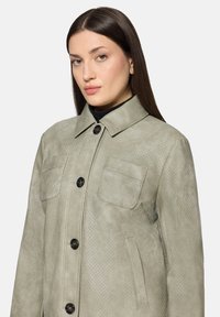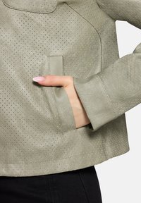 Lichtgroene, geperforeerde leren jas met kraag, twee borstzakken en zwarte knopen. Ontworpen met een gestructureerde, cropped pasvorm.