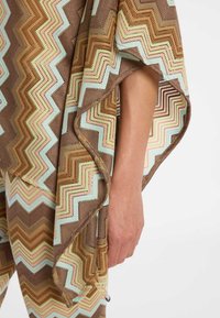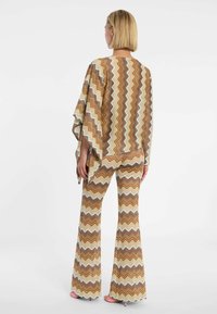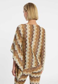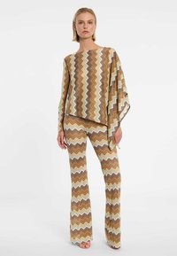 De asymmetrische gebreide top Duola in aardetinten is een absoluut hoogtepunt voor liefhebbers van de jaren '70 retro-look. Gemaakt van fijn zomerbreisel, overtuigt het met een opvallend zigzagpatroon in warme bruine en beige tinten. De bijzondere snit combineert een strakke lange mouw aan de ene kant met een wijde, vloeiende poncho-mouw aan de andere kant. Voor een stijlvolle verschijning op vakantie of bij een creatief evenement combineer je de top als modieuse tweedelige set met de bijpassende flarepantalon Dorea. Draag daarbij elegante plateau sandalen of eenvoudige mules en kies een hoogwaardige suède tas. Met grote gouden creolen geef je je outfit de perfecte vintage-touch.