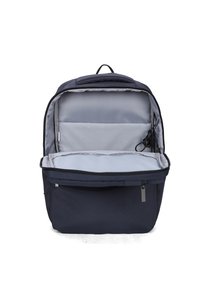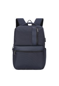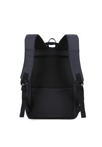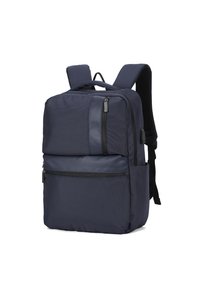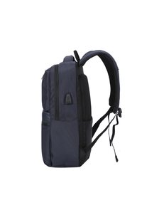Marineblauwe rugzak met gevoerde schouderbanden, bovenhandvat, voorkant en verticale ritszakken, ontworpen voor dagelijks gebruik of reizen.