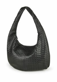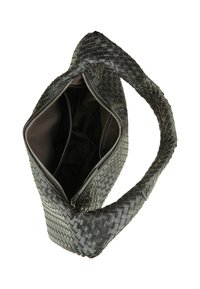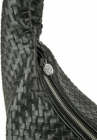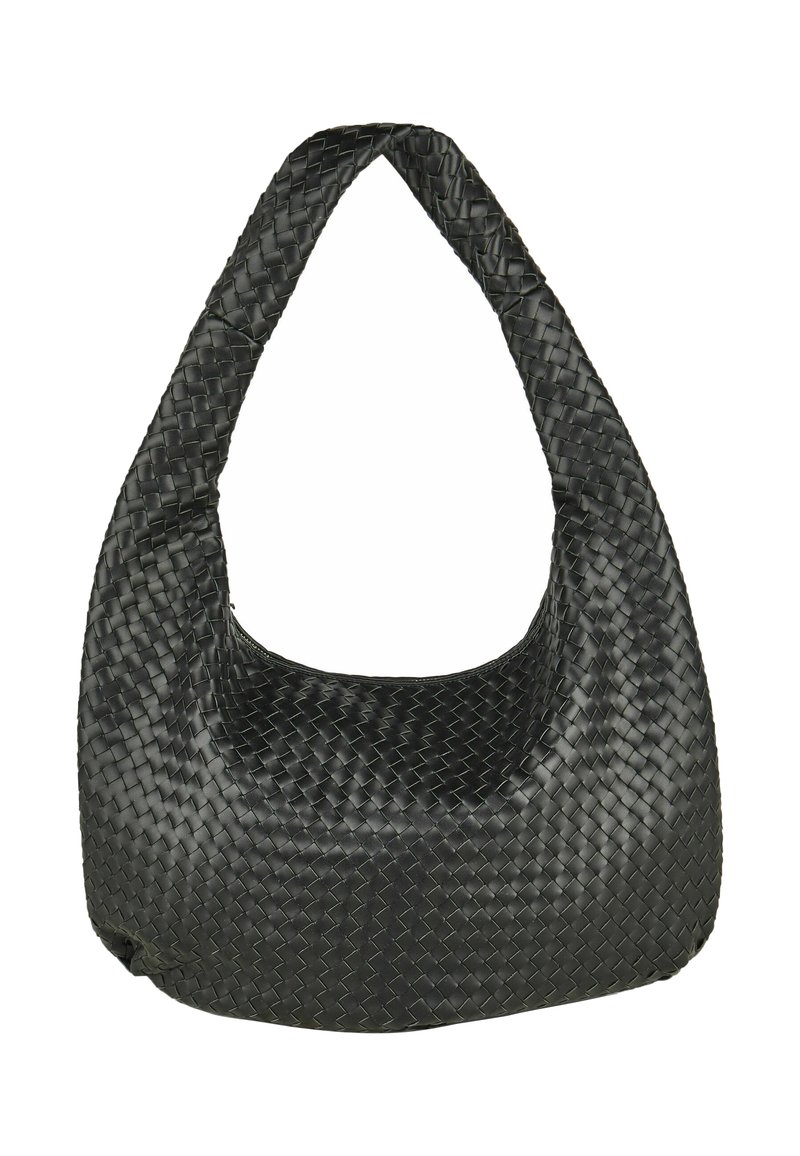 Zwarte schoudertas van geweven leer met een brede band en een iets afgeronde rechthoekige vorm.