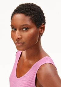 Vrouw met kort krullend haar, gekleed in een mouwloos roze geribd V-hals topje en losse roze broek, poserend met één hand achter haar nek.