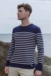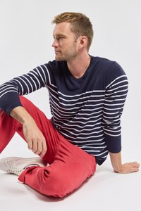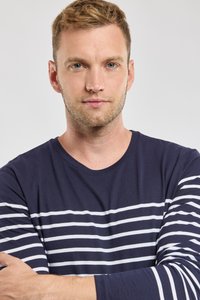 Man met kort blond haar, gekleed in een marineblauw shirt met lange mouwen met witte horizontale strepen en een rode broek, staand tegen een effen lichte achtergrond.