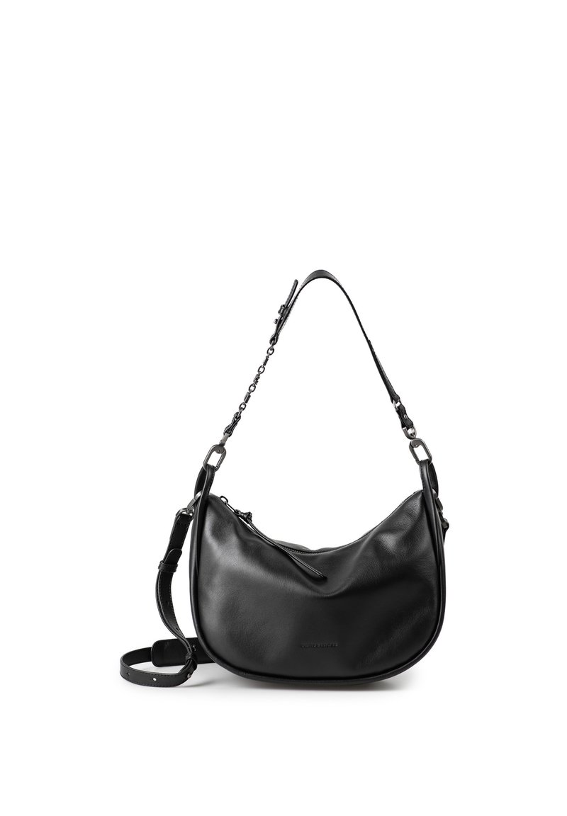 Zwarte leren handtas in halvemaanvorm met verstelbare ketting en leren schouderriem, ritssluiting en subtiele merkopdruk aan de voorkant.