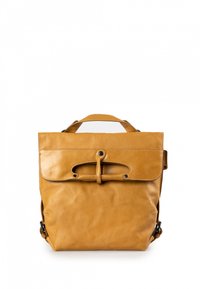 Persoon draagt een olijfgroene jas en een grote zwarte leren rugzak met een klep en gespsluiting.