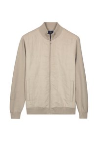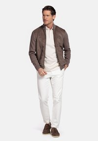 Man die een bruin jack met ritssluiting draagt over een wit poloshirt en witte broek, staand met één hand in zijn zak en de andere hand bezig met het aanpassen van het jack.