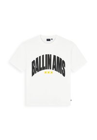 Man met blond haar, gekleed in een zwart T-shirt met "BALLIN AMS XXX" in wit en geel, lichtblauwe spijkerbroek en een zilveren ketting, kijkt naar links.