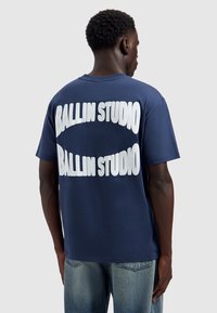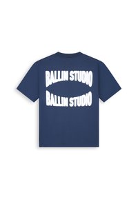 Man die een donkerblauw T-shirt draagt met "BALLIN STUDIO" twee keer in grote witte letters op de achterkant, gecombineerd met lichtblauwe spijkerbroek.