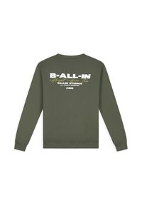 Man met een olijfgroene trui met witte en gele tekst "B-ALL-IN Alright Hear This BALLIN STUDIOS AMS" op de achterkant.