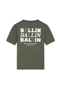 Blonde man zijwaarts kijkend, draagt een groen T-shirt met grote witte tekst "BALLIN" die drie keer wordt herhaald, met kleinere tekst eronder.