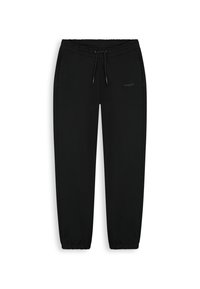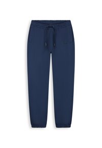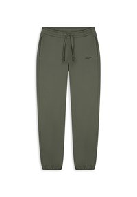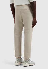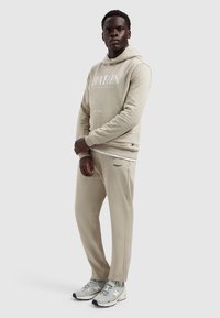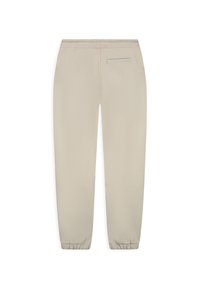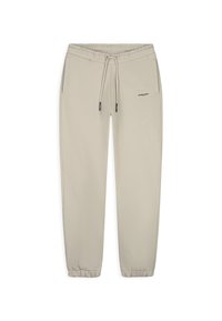 Man draagt beige joggerbroek met elastische boorden en een trekkoord in de taille, gecombineerd met grijze New Balance sneakers tegen een effen grijze achtergrond.