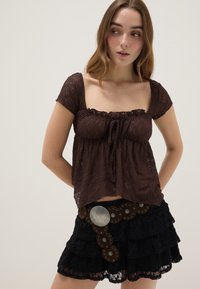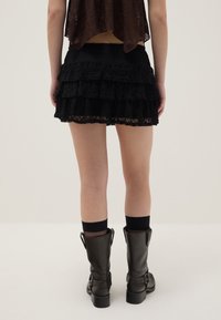 De zwarte kanten minirok uit de B.Angel-collectie biedt een vleugje originaliteit en stijl. De comfortabele, elastische tailleband zorgt voor een perfecte pasvorm, waardoor het een veelzijdig kledingstuk is voor elke gelegenheid.