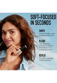 Voor een eenvoudige, vlekkeloze applicatie veeg je de huidtintstick over de wangen, neus, voorhoofd en kin. Blend het product met de Smoothing Face Brush of je vingertoppen in zachte bewegingen naar buiten toe. Herhaal dit en breng extra lagen aan op plekken die meer dekking nodig hebben.