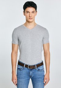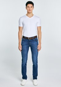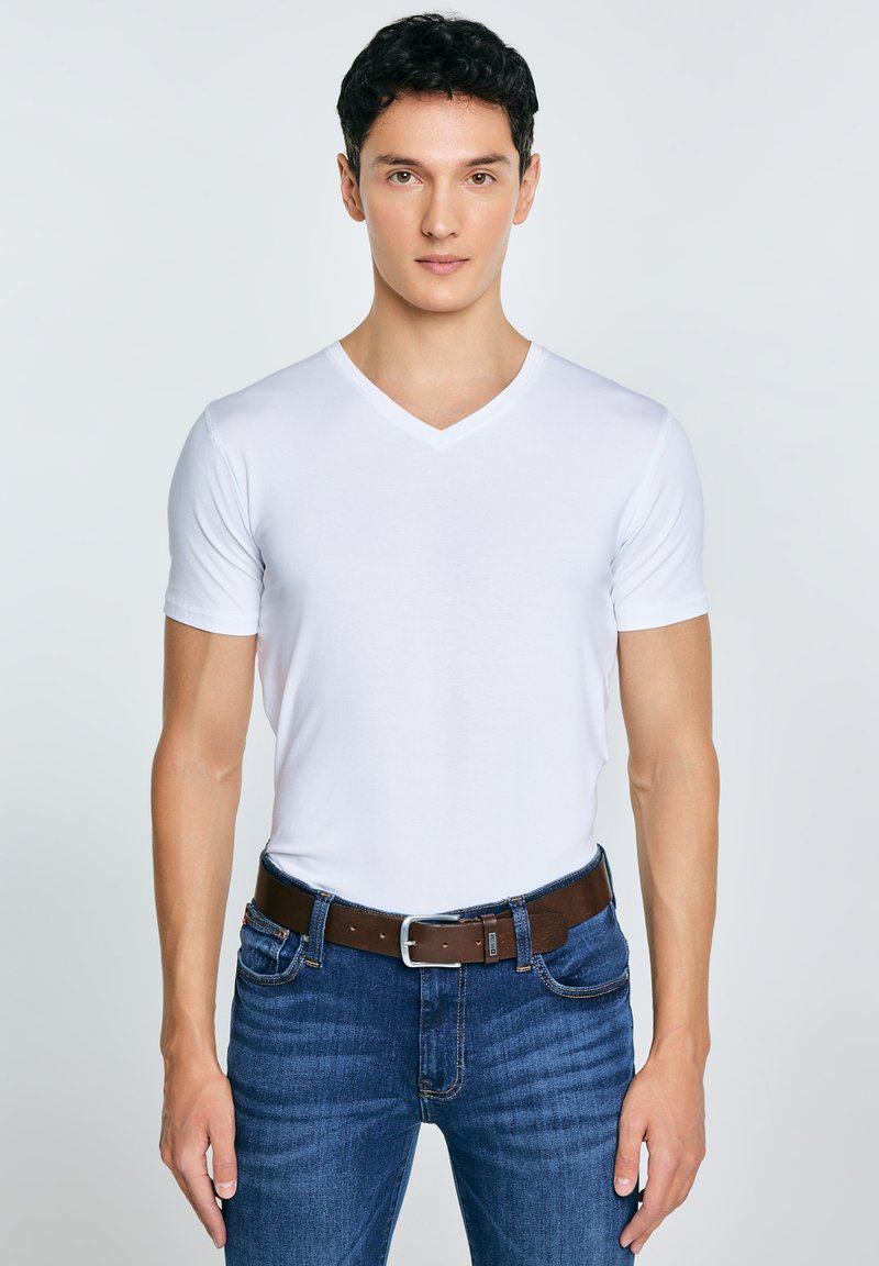 Jonge man die een effen wit V-hals T-shirt draagt, ingestopt in een blauwe spijkerbroek met een bruine riem, staand tegen een lichte achtergrond.