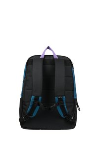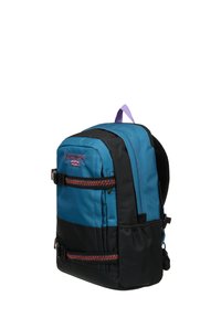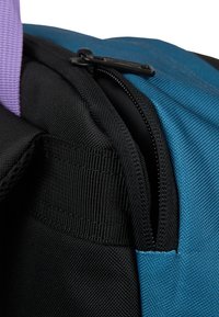 Blauwe en zwarte rugzak met ritssluiting, voorzien van verstelbare riemen, twee gespjes aan de voorkant en een paarse bovenste handgreep. Billabong-logo zichtbaar.