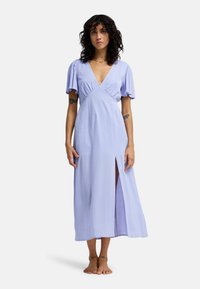 Lichtgroene maxi-jurk met een V-hals, korte pofmouwen en een zijsplit. Geweven stof met een vloeiende silhouet en geen zichtbare sluitingen.