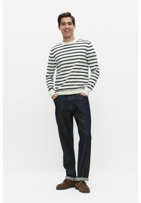 Man met een wit shirt met lange mouwen en zwarte horizontale strepen, en donkerblauwe spijkerbroek, handen in de zakken, kijkt opzij.