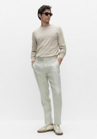 Man met beige trui met lange mouwen en lichtgrijze broek, poserend met donkere zonnebril, kijkend naar links tegen een effen achtergrond.