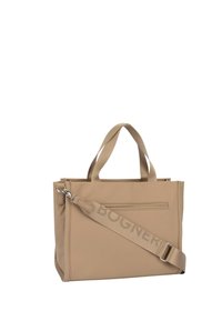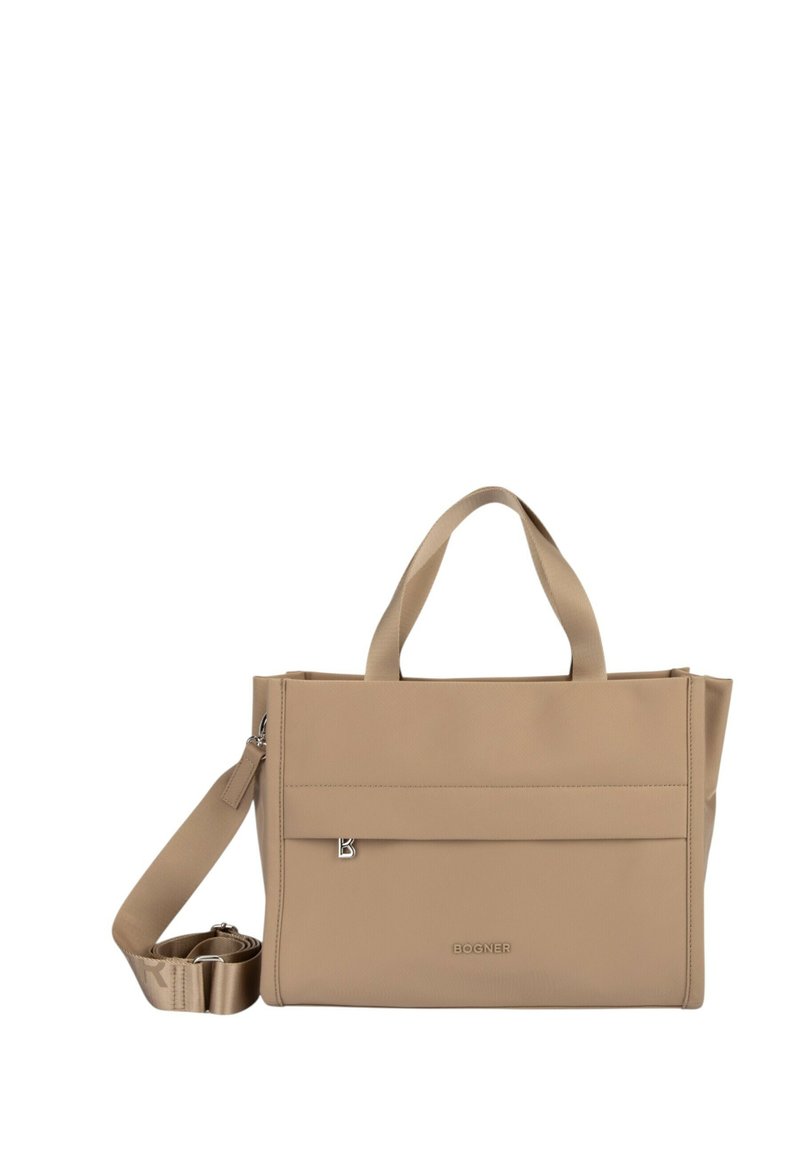 Beige rechthoekige handtas met twee handvatten, verstelbare schouderriem, voorvak met klep en subtiel "Bogner"-logo.