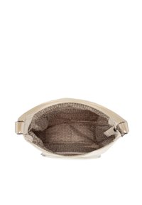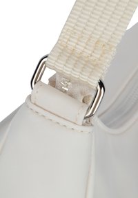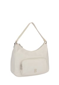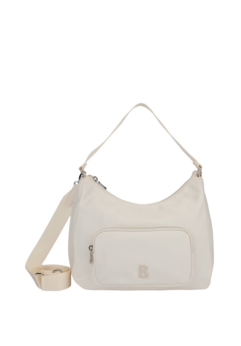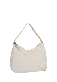 Crèmekleurige medium handtas met voorvak met rits, korte handgreep en afneembare, verstelbare schouderriem.