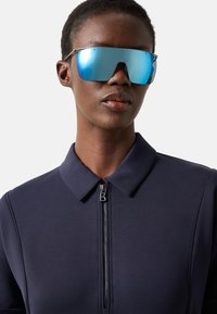 Persoon draagt een marineblauw kortemouwen overhemd met kraag en rits, bijpassende korte broek en grote reflecterende blauwe zonnebril, staand tegen een effen achtergrond.