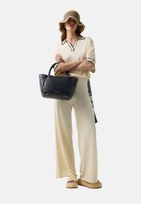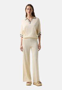 Vrouw met stijlbruin haar draagt een crèmekleurige gebreide top met zwarte bies op de kraag en mouwen, gecombineerd met bijpassende gebreide broek.