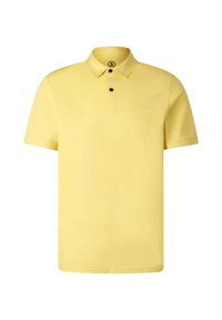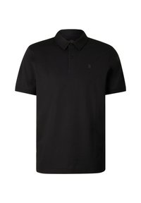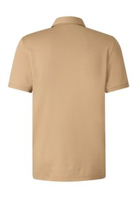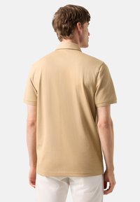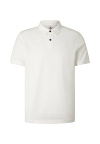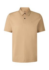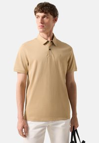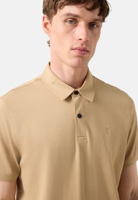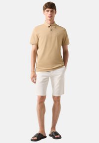 Jonge man met een beige polo met korte mouwen en witte broek, houdt een zwarte tas in zijn rechterhand en kijkt naar links.