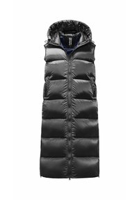 Zwarte gewatteerde bodywarmer met een capuchon, met een glanzende afwerking, een gewatteerd ontwerp en textuur grijze mouwen. Sluit met een centrale rits.