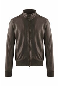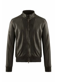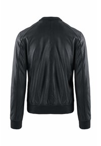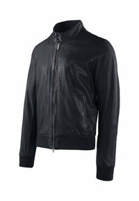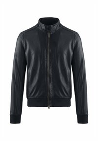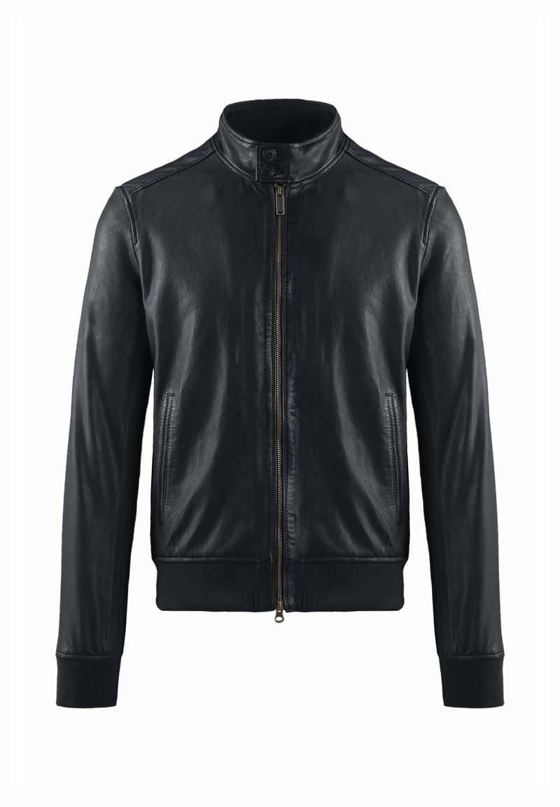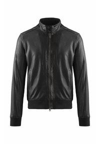 Zwarte leren jas met ritssluiting aan de voorkant, kraag met drukknopen, zijzakken en geribbelde boorden en zoom tegen een witte achtergrond.