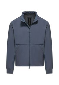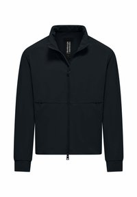 Donkergroene jas met rits, opstaande kraag, geribde manchetten en zakken aan de voorkant, weergegeven tegen een effen witte achtergrond.
