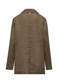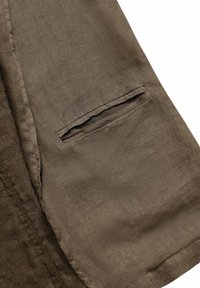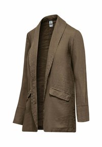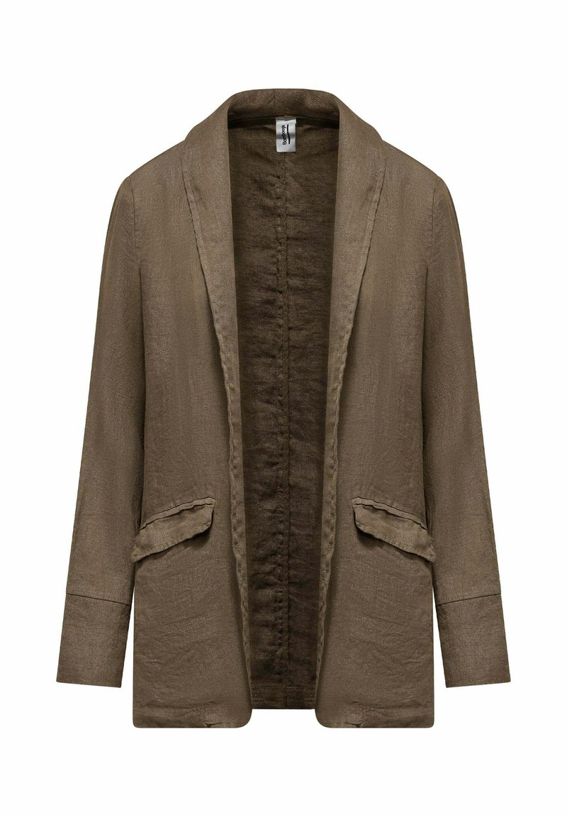 Bruine linnen blazer met open voorkant, lange mouwen en twee klepzakken aan de voorkant, afgebeeld tegen een witte achtergrond.
