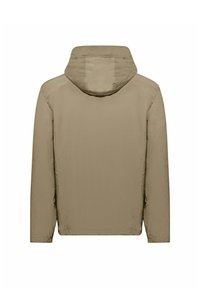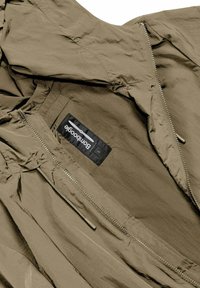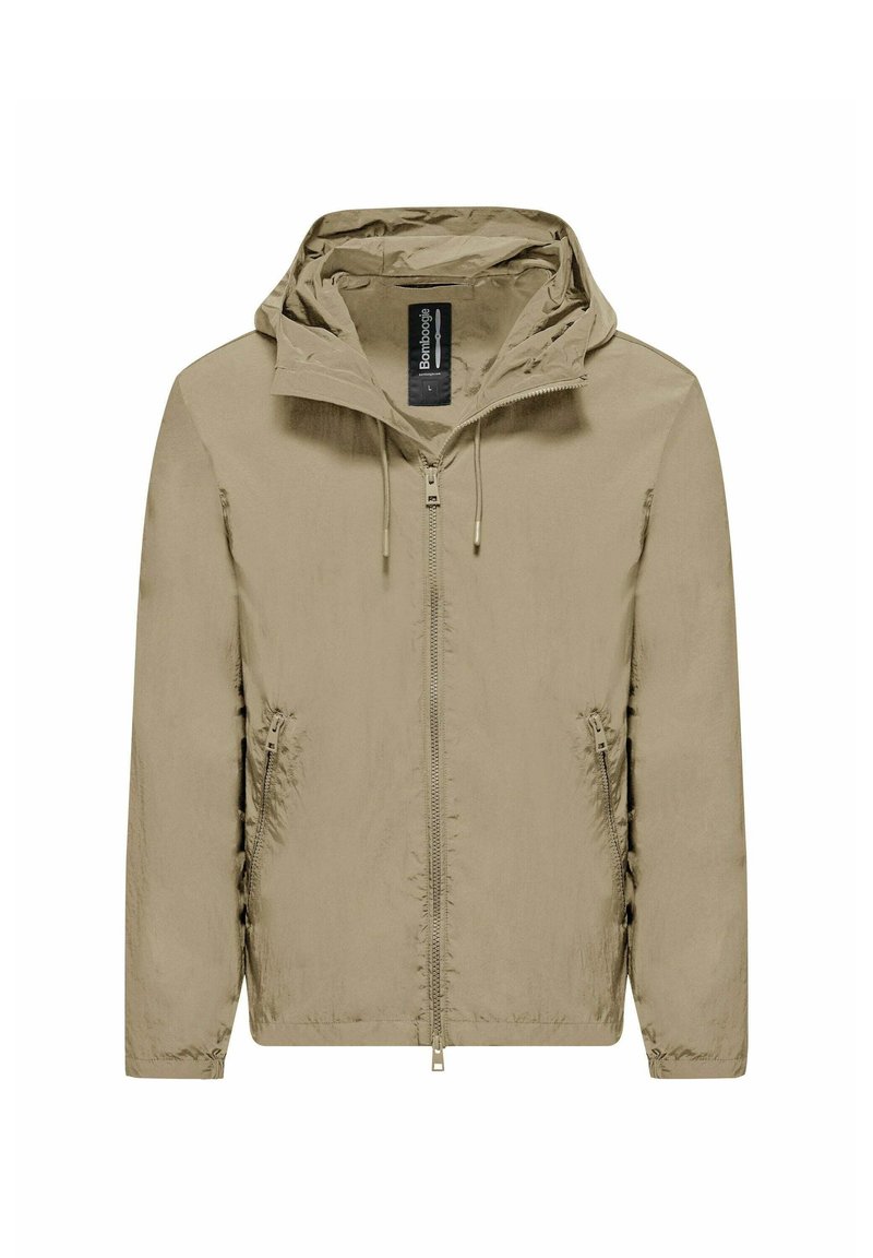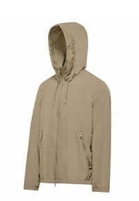 Lichtbruine capuchonjas met volledige ritssluiting aan de voorkant, trekkoorden aan de kap en met rits afsluitbare zijzakken, gemaakt van lichtgewicht stof.