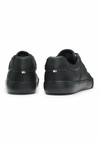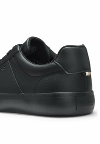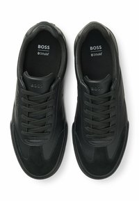 Zwarte lage leren sneaker met een geribbelde rubberen zool, zwarte veters en een geperst "BOSS"-logo op het zijpaneel.
