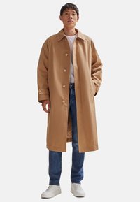 Beige katoenen trenchcoat met een rechte snit, grote kraag en knoopsluiting, gecombineerd met blauwe jeans en witte sneakers.