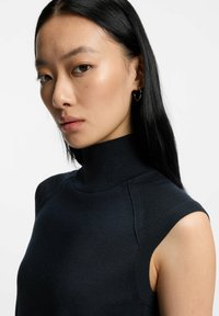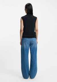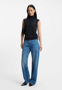 Zwarte mouwloze top met een hoge hals, voorzien van een aansluitend ontwerp en geribde zoom. Gecombineerd met lichtblauwe jeans met rechte pijpen.