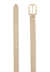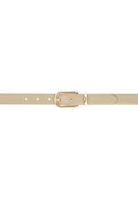 Beige leren riem met textuur en een ronde gouden metalen gesp, plat neergelegd op een witte achtergrond.