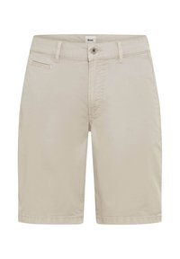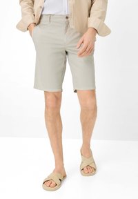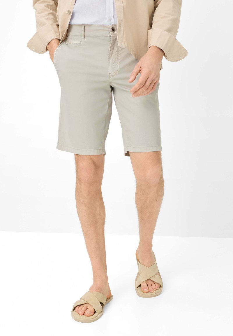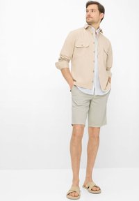 Man draagt beige korte broek, bruine sandalen met gekruiste banden, wit shirt en beige jas, staat met één hand in de zak.