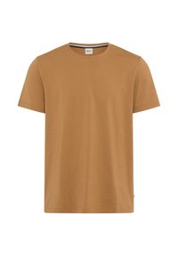 Man met een lichte huid en kort bruin haar, gekleed in een marineblauw T-shirt en beige broek, staand met één hand in de zak, kijkend naar boven.