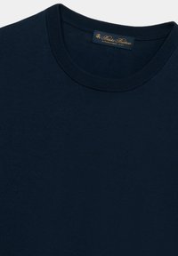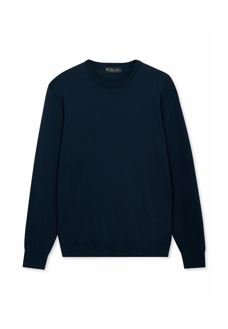 Navyblauwe trui met lange mouwen en ronde hals, voorzien van geribde boorden en zoom, weergegeven tegen een witte achtergrond.
