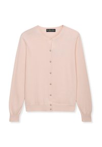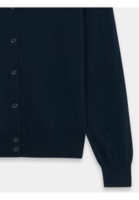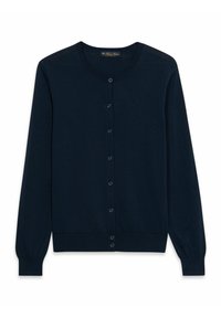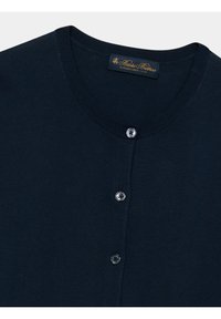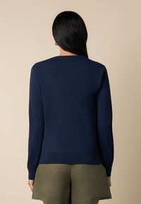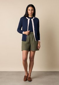 Vrouw met lang donker haar, gouden oorringen, een marineblauw vest met knopen en olijfgroene korte broek tegen een beige achtergrond.