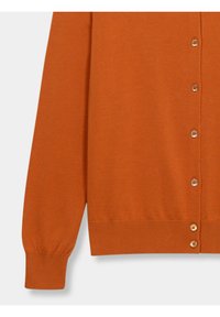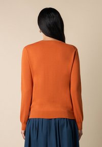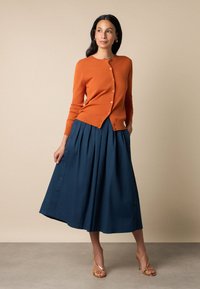 Vrouw die een gebuttondown gebrande oranje cardigan en een marineblauwe geplooide rok draagt, staand tegen een beige achtergrond.