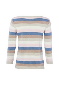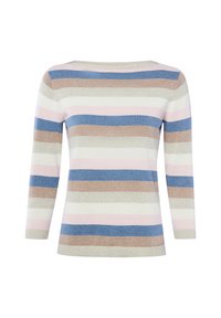 Langarmtrui van gebreide stof met horizontale strepen in beige, blauw, wit en lichtroze, voorzien van een ronde hals.