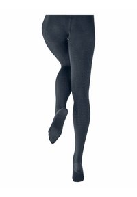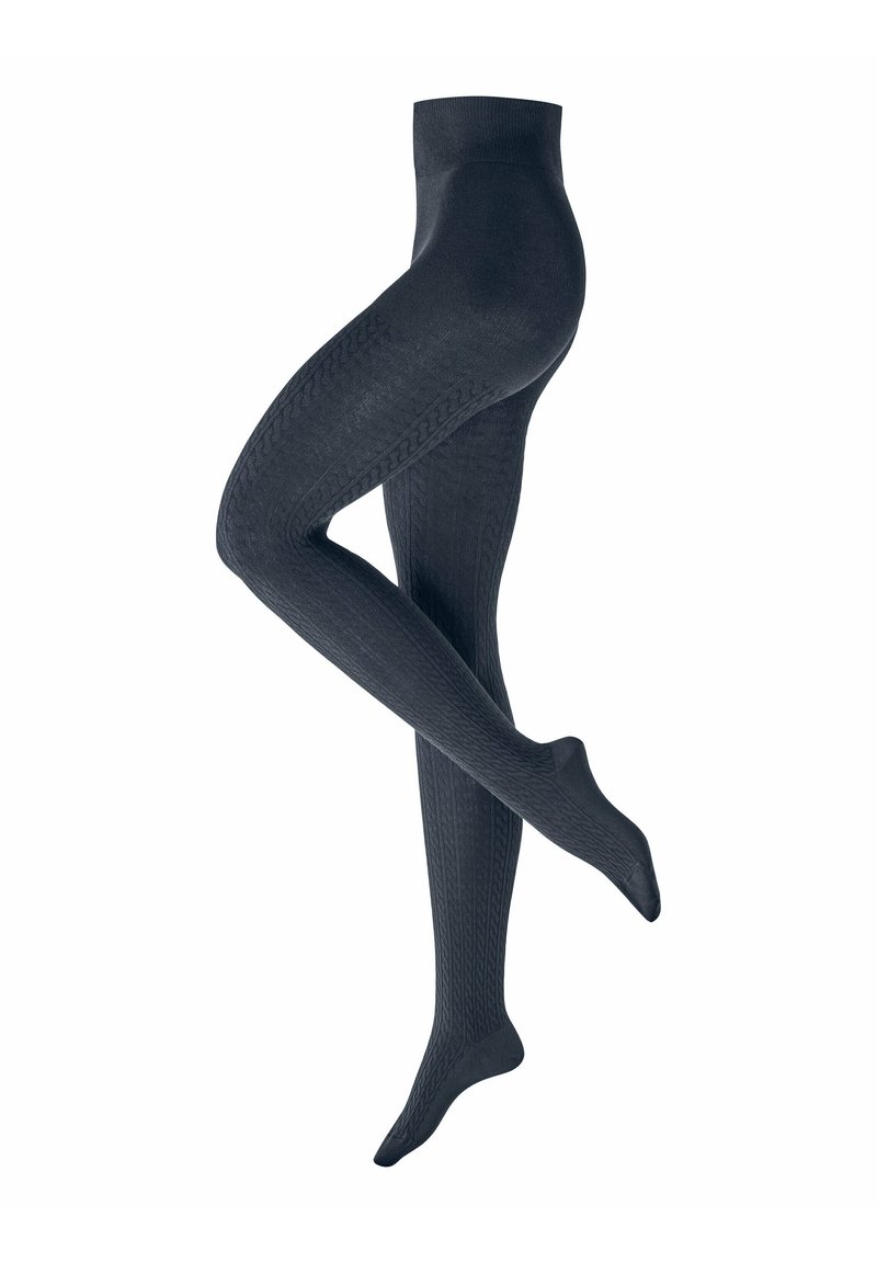 Zwarte panty's met kabelpatroon, getoond op gekruiste benen tegen een witte achtergrond.