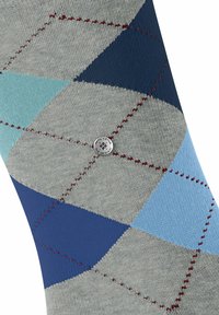 Grijze katoenen sokken met een ruitpatroon in lichtblauw, donkerblauw en marineblauw, met rode stiksels. Midden kuitlengte.
